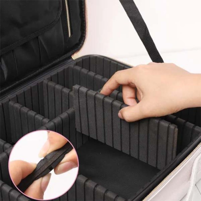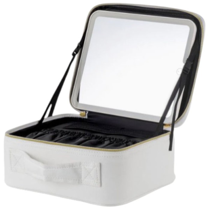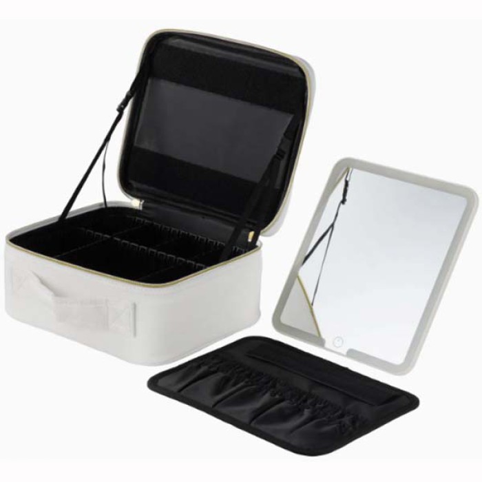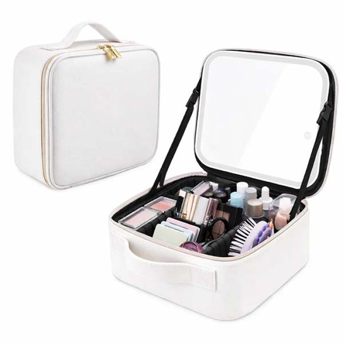 Дорожня косметичка з дзеркалом та підсвіткою - елегантна та компактна косметичка-органайзер, оснащена дзеркалом зі світлодіодним підсвічуванням, що забезпечує бездоганне застосування, де б ви не знаходилися. Косметичка розділена різними перегородками, які призначені для вільного збирання. Ви можете зберігати косметику в різних категоріях, а місткість може задовольнити щоденні потреби і потреби в подорожах. Містка косметичка - органайзер для зберігання косметики чудово організує простір і вміщує всі потрібні вам предмети та аксесуари: косметику, прикраси, парфумерію, флакони та інші косметичні речі. Вона має 5 знімних роздільників та органайзер із 4 кишеньками для зберігання кистей для макіяжу. Світлодіодне дзеркало оснащене сенсорною кнопкою включення та 3 режимами світла: холодний, теплий, природний. Світловий стан може бути відрегульований у будь-який час відповідно до ваших уподобань та різних випадків. Зробіть макіяж чіткішим та зручнішим. Щоб перемикати режими, достатньо натискати по черзі кнопку включення. Тривале натискання кнопки може регулювати яскравість від 0 до 100%. Дзеркало акумуляторне, в комплекті передбачений кабель USB зарядки. Косметичка-органайзер на вигляд нагадує невелику валізку. На верхній частині є ручка, за допомогою якої виріб зручно переносити. Дзеркало знімне та оснащене підставкою, що дозволить поставити його у будь-якому місці. Виготовлена косметичка із міцного матеріалу, який відмінно тримає форму, не пропускає пил та вологу. Ваша косметика під час поїздки буде акуратно складена та надійно захищена від забруднень. Основні характеристи: - Розмір дзеркала: 24.2х18.6 см - Розмір косметички (ДхШхВ): 26х21х13 см - Розмір органайзера для пензлів: 23.5х18 см - Довжина кабелю заряджання дзеркала: 97 см Комплектація: косметичка-органайзер, світлодіодне сенсорне дзеркало, органайзер для пензлів, кабель зарядки.