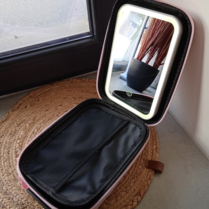 Переваги: 1) Вбудоване дзеркало з LED-підсвіткою — яскраве, рівномірне освітлення для бездоганного макіяжу навіть у темних місцях. 2) Акумуляторне живлення (1200 мА·год) — дзеркало завжди готове до роботи, без потреби в батарейках. 3) Зручна зарядка від USB — легко під’єднати до павербанку, ноутбука чи адаптера. 4) Компактний формат (23×13×8 см) — поміститься навіть у не дуже велику сумку. 5) Практичний дизайн у вигляді маленької валізи — елегантний вигляд, приємний на дотик матеріал і надійна застібка-блискавка.
