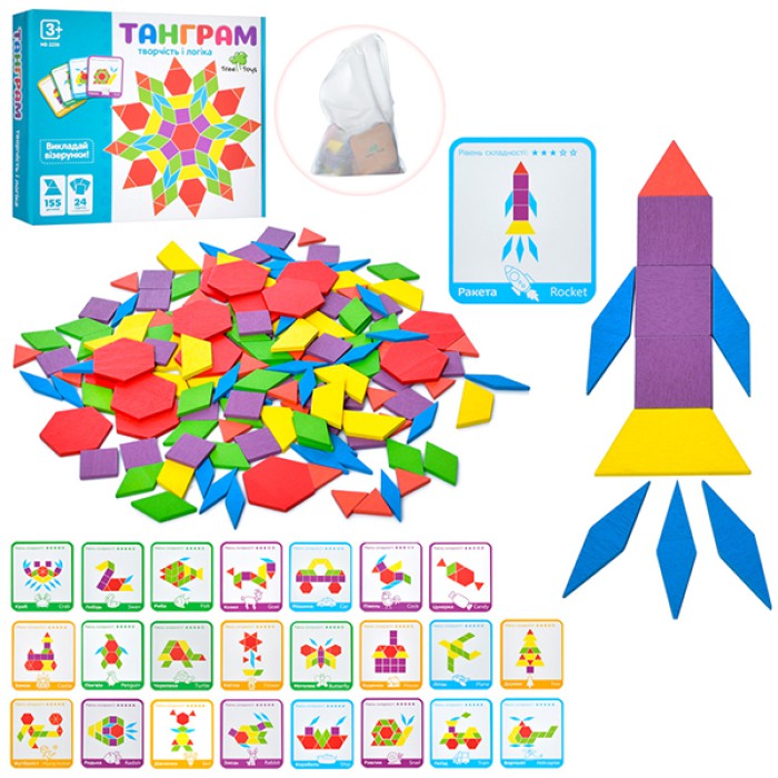 Особливості набору: - 155 яскравих дерев'яних блоків різних форм. - Багатокутники, квадрати, трикутники та інші фігури. - Картки із завданнями та схемами для складання. - Виготовлено з якісного, безпечного дерева. - Зручна коробка для зберігання.