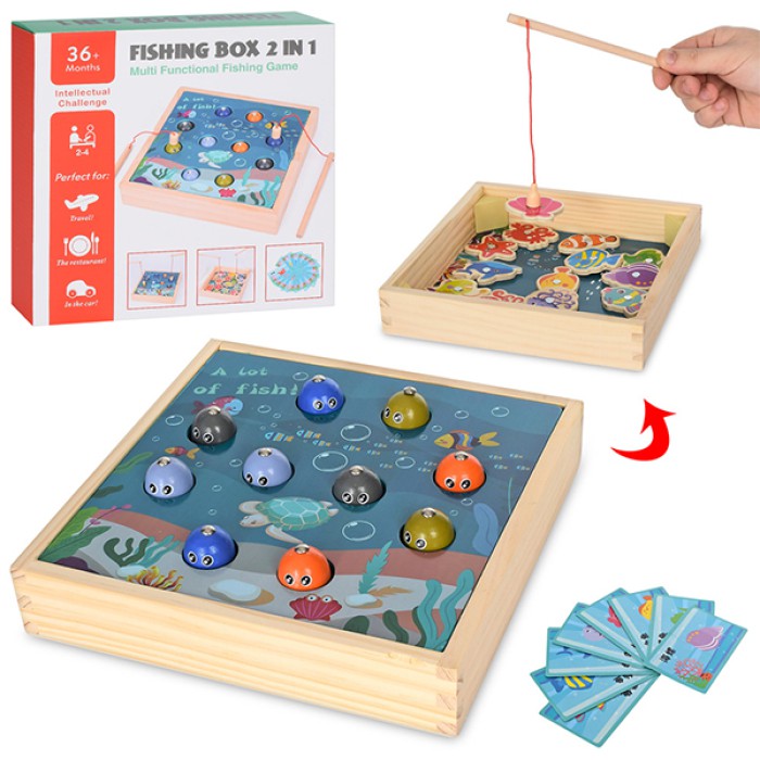 Особливості: - Магнітна рибалка з дерев’яними фігурками. - Ігрове поле двостороннє (2в1). - Набір морських мешканців із магнітами. - 2 дерев'яні вудочки — для спільної гри. - Упаковано в міцну подарункову коробку.