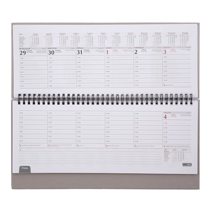 - Дві сторінки (розворот) містять вертикально розміщені 7 днів тижня (субота та неділя в одному стовпчику) з організатором часу від 7:00 до 20:00, календар на рік та на поточний місяць, знак зодіаку, іменинників, свята та пам'ятні дати на кожен день, а також вільне поле для нотаток;