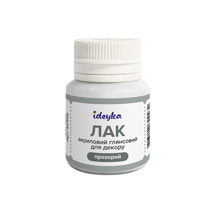 Глянцевий акриловий лак для декору від Ideyka® використовують для фінішного покриття картин за номерами і алмазної мозаїки. Він утворює міцну водостійку плівку, завдяки чому: - посилює блиск поверхні - поверхня більш стійка до різких температурних перепадів - підвищується теплопровідність і вологостійкість - підвищується стійкість до механічних впливів - поверхня більш стійка до впливу ультрафіолетового випромінювання - поверхня надійно захищена від цвілі і згубного впливу мікроорганізмів. Даного обсягу 20 мл вистачає на 2 картини за номерами 40х50 см або одну алмазну мозаїку 40х50 см. Лак готовий до використання: не вимагає додавання води. Перед використанням збовтати.
