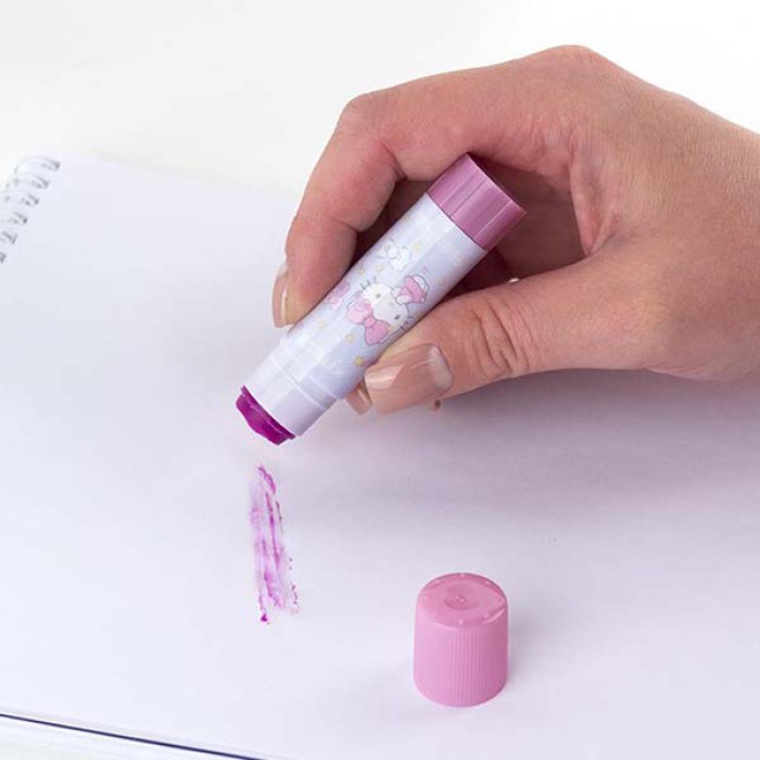 Клей-олівець – справжня знахідка для школярів і дошкільнят (для занять в садочку чи під наглядом дорослих). Він компактний і практичний, не проливається та не розмазується. Чудово склеює папір, картон та фотографії: а значить, ідеально підходить для творчості вдома, у школі і в дитячому садочку. Склеєний з його допомогою папір не морщиться та не деформується: аплікації будуть акуратними та красивими. Формат «стік» – максимально зручний, щоб брати його з собою в школу, садочок або на творчі заняття. Він відмінно поміщається в пеналі-косметичці або тубусі, кишені фартуха і в настільному органайзері. PVP-клей не містить розчинників і має нейтральний запах. Він абсолютно безпечний для використання за призначенням. Індикатор нанесення допомагає дитині розвивати акуратність. Кольоровий клейовий слід добре помітний, тому його нанесення легко контролювати. Відразу після висихання слід стає безбарвним. Дизайн корпусу в популярній ліцензії Hello Kitty даруватиме натхнення і заряджатиме позитивом. Особливості: простий у використанні – має однорідну консистенцію, легко і рівномірно наноситься; безпечний – не містить розчинників і має нейтральний запах; призначення – легко склеює папір, картон, фотографії; універсальний – підходить для уроків праці в садочку, школі і незамінний для домашнього використання; продуманий до дрібниць – ідеально підходить для шкільного пенала: обсяг – 8 г, висота корпусу – 87 мм; при правильному зберіганні довго зберігає свої якості – термін придатності – 24 місяці; яскравий дизайн корпусу в ліцензії Hello Kitty – для натхнення.