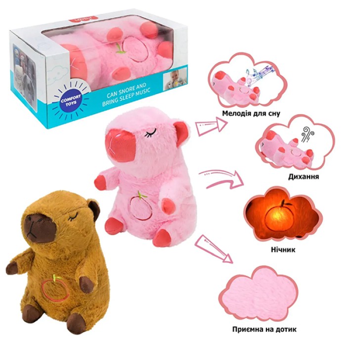 Особливості: - розмір: 18х15х30 см; - працює від 3-х батарейок типу ААА (до комплекту не додано); - при натисканні на ніжку іграшки починає дихати, підсвічуватись, сопіти та відтворювати заспокійливу музику; - іграшка виготовлена у вигляді милої капібари; - допомогає дитині розслабитися та швидко заснути; - сопить; - виготовлена з м’яких та приємних на дотик матеріалів; - наповнювач: синтепон.