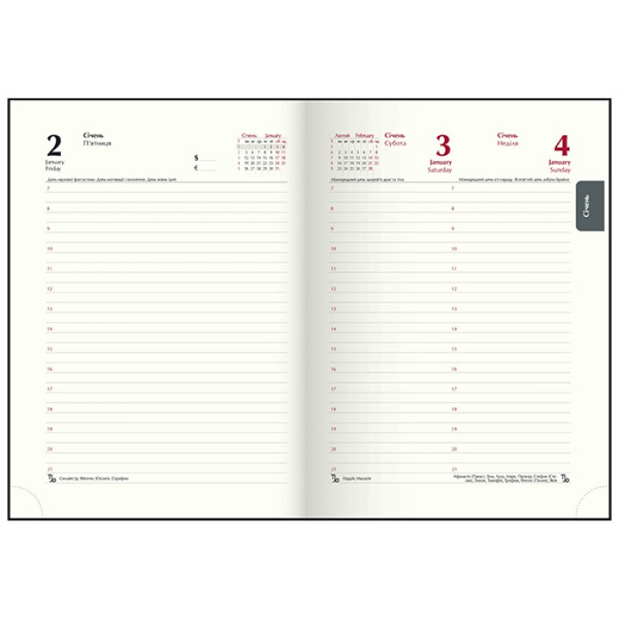 Структура внутреннего блока: - страница для внесения личной информации. - Календари на 2025 – 2028 годы. – Планинг на 2026 год. - Информационно-справочный блок: национальные, религиозные, профессиональные праздники и памятные даты, знаки зодиака, телефонные коды мобильных операторов и областных центров Украины, буквенные автомобильные коды стран, таблица расстояний между областными центрами Украины, справочник систем измерения, международные знаки соответствия, знаки ухода. - датированная страница на каждый день года с организатором времени от 7:00 до 21:00, календарем на текущий/следующий месяц, обозначением дня. недели, знак зодиака, именинников. - алфавитная книга для внесения контактов.
