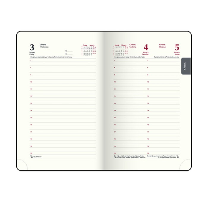 Щоденник датований А6 2025 TOUCH ME чорний Стильна жорстка обкладинка щоденника TOUCH ME виготовлена зі штучної шкіри з ефектом RUBBER TOUCH, що робить обкладинку дуже ніжною, немов оксамитовою, на дотик. Чудовим доповненням до дизайну є тиснення року на корінці та поздовжня гумка в колір обкладинки, яка перешкоджає відкриттю і пошкодженню внутрішнього блоку. Образ гармонійно завершує зріз, тонований в колір обкладинки. Формат А6 336 сторінок Внутрішній блок: офсетний папір кремового кольору щільністю 70 г/м² Закладка-лясе в колір обкладинки Перфоровані куточки аркушів Друк блоку в 2 кольори: сірий і бордовий Дві мови блоку: українська, англійська Мапи України та Європи на форзацах Індивідуальна упаковка: картонна коробка Структура внутрішнього блоку: Сторінка для внесення особистої інформації Календарі на 2024 - 2027 роки Планінг на 2025 рік Інформаційно-довідковий блок: національні, релігійні, професійні свята та пам'ятні дати, знаки зодіаку, телефонні коди мобільних операторів та обласних центрів України, літерні автомобільні коди країн, таблиця відстаней між обласними центрами України, довідник систем вимірювання, міжнародні знаки відповідності, знаки догляду за одягом Датована сторінка на кожен день року з організатором часу від 7:00 до 21:00, календарем на поточний/наступний місяць, позначенням дня тижня, знаку зодіаку, іменинників Алфавітна книга для внесення контактів