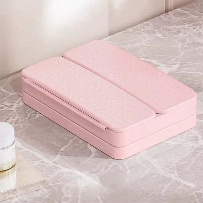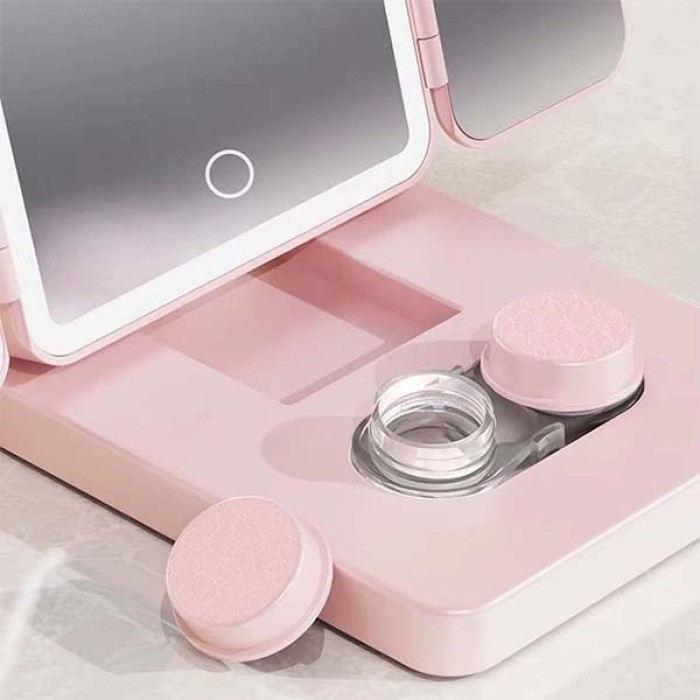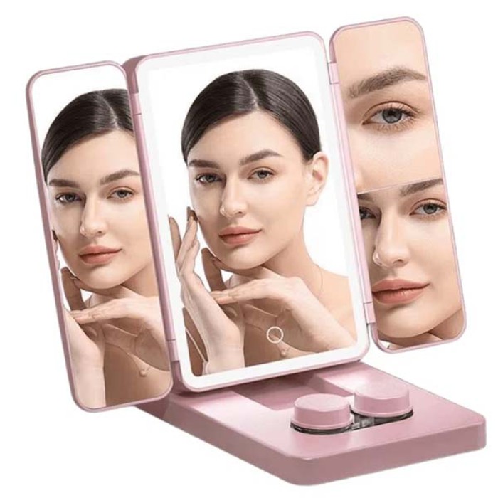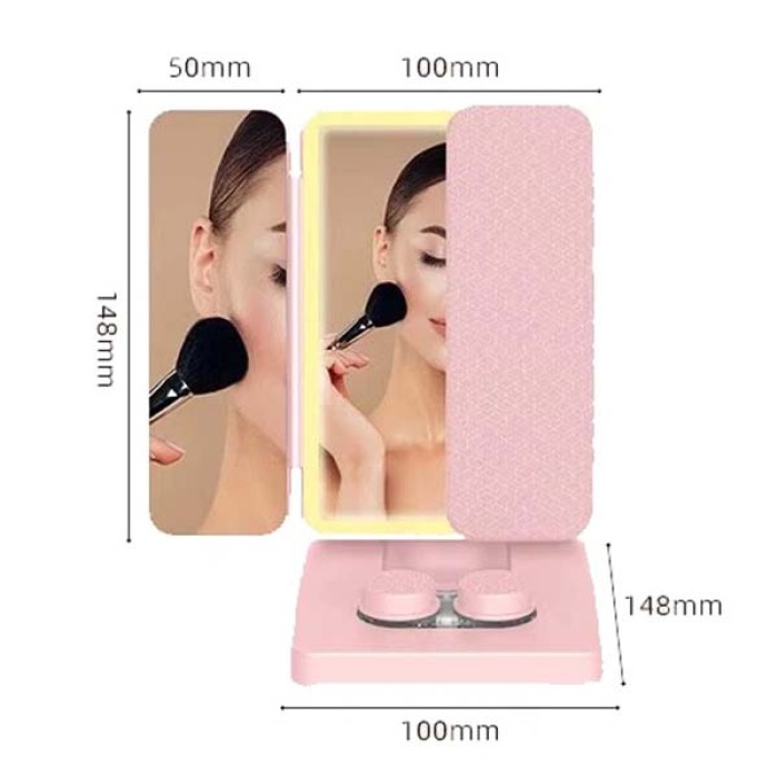 Потрійне дзеркало для макіяжу косметичне з LED підсвічуванням та відділом для лінз Потрійне дзеркало для макіяжу з LED-підсвічуванням — це ідеальний аксесуар для створення бездоганного макіяжу у будь-яких умовах освітлення. Завдяки потрійному збільшенню ви зможете ретельно опрацювати навіть найдрібніші деталі макіяжу, а м’яке світло LED-лампочок забезпечить чітке та рівномірне освітлення обличчя. Дзеркало не лише спрощує процес нанесення косметики, але й додає елегантності вашому туалетному столику завдяки стильному рожевому кольору. Корпус виготовлений із міцного ABS-пластику, який стійкий до подряпин і зношування, а якісне скло гарантує точне відображення без спотворень. Дзеркало працює як від USB, так і від батарей, що робить його зручним для використання вдома або в дорозі. Компактні розміри дозволяють легко переносити аксесуар, а спеціальний відсік для лінз додає практичності. Це чудове поєднання краси, функціональності та зручності для щоденного догляду. Переваги: Потрійне збільшення: Забезпечує точність при нанесенні макіяжу та догляді за шкірою. Яскраве LED-підсвічування: Гарантує рівномірне освітлення без тіней, навіть у темному приміщенні. Міцний корпус: Виготовлений із ABS-пластику, стійкого до пошкоджень та зношування. Зручне живлення: Може працювати як від USB, так і від батарейок, що забезпечує мобільність. Стильний дизайн: Ніжний рожевий колір пасує будь-якому інтер’єру. Характеристики: Тип: Дзеркало для макіяжу потрійне Підсвічування: LED Матеріал: Скло, ABS-пластик Живлення: USB/акумулятор Акумулятор: 500 mAh Розмір: 14.8 x 10 x 3.15 см Комплектація: Дзеркало для макіяжу Заводська упаковка