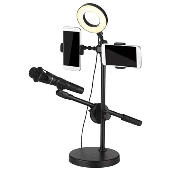 Кільцевий світильник LED Youtuber з подвійною підтримкою мікрофона телефона, набір для фото- та відео Кільцева лампа блогера з подвійною підтримкою мікрофона та телефона. Кільцева лампа з подвійною підтримкою мікрофона та телефона — це ідеальний інструмент для створення якісного освітлення та звукозапису для ваших фото- та відеопроєктів. Завдяки своєму кільцевому дизайну він забезпечує рівномірне та м'яке освітлення без тіней і відблисків, що ідеально підходить для професійного знімання портретів, відеоблогів, стримань у соціальних мережах та інших творчих проєктів. Особливості та переваги: 1. Кільцева конструкція: Кільцева форма світильника забезпечує рівномірне освітлення обличчя без тіней, створюючи ідеальні умови для професійної фото- та відеознімання. 2. Подвійна підтримка мікрофона: Світильник обладнаний двома кріпленнями для мікрофонів, що дає змогу одночасно використовувати два мікрофони для поліпшення якості звуку відео. 3. Регульована яскравість: Інтегрований пульт керування дає змогу плавно регулювати яскравість світла від м'якого до яскравого, щоб відтворювати потрібний настрій і ефект залежно від вашого проєкту.