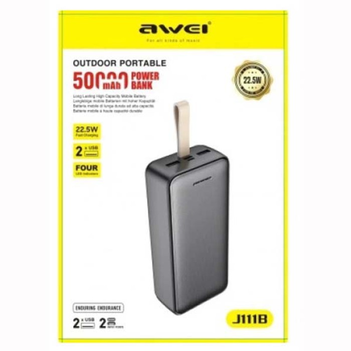 Power Bank Awei J111B - 50000mAh - це портативний зарядний пристрій високої ємності (50000 мАч) з вихідною потужністю 22,5 Вт, призначений для швидкого заряджання кількох гаджетів одночасно. Воно оснащене захистом від короткого замикання та перевантаження, індикатором рівня заряду та міцним корпусом, що робить його надійним рішенням для подорожей та використання поза домом. Місткість: 50000 мАг. Потужність: 22,5 Вт для швидкого заряджання. Функціональність: Заряджає кілька пристроїв одночасно. Вбудований індикатор заряду. Безпека: Захист від короткого замикання та перевантаження. Надійність: Міцний корпус із високоякісних матеріалів. Застосування: Ідеально підходить для подорожей, активного відпочинку та ситуацій, коли немає доступу до електричної мережі.