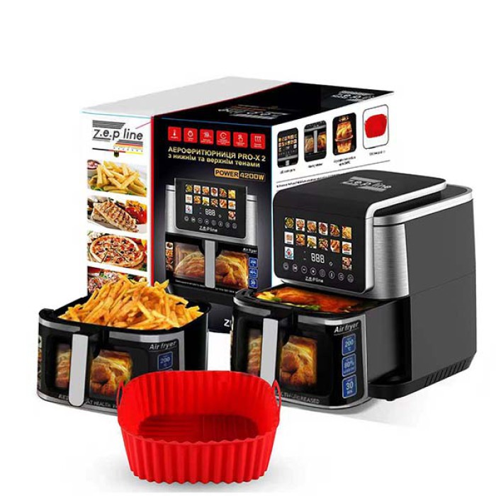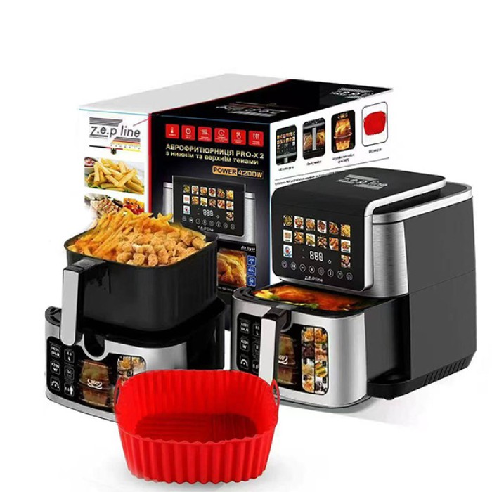 Фритюрниця Zepline ZP-00339 — це універсальний багатофункціональний прилад, що поєднує можливості фритюрниці, аерогрилю, духовки та грилю. Завдяки інноваційній технології циркуляції гарячого повітря на 360°, страви рівномірно пропікаються без додавання або з мінімальною кількістю олії. Прилад ідеально підходить для щоденного приготування здорової їжі для всієї родини. Модель оснащена двома потужними ТЕНами, які забезпечують швидке нагрівання та стабільний розподіл тепла по всьому об’єму. Об’єм камери 13 л дозволяє готувати великі порції, цілі курки, кілька страв одночасно або експериментувати зі стравами різної складності. Силіконова форма та знімний кошик роблять процес приготування й подальшого очищення простим та зручним.