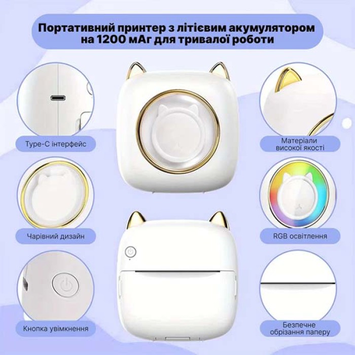 Пропонуємо вам чудовий пристрій, який поєднує в собі креативний дизайн і високу функціональність — мініпринтер з оригінальним застосунком Fun Print.Цей чудовий принтер стане незамінним супутником для творчих дітей і дорослих, адже він дає змогу друкувати чіткі зображення й нотатки на ходу, даруючи вам безліч можливостей для самовираження й організації. Принтер виготовлений у формі милого котика з RGB-підсвіткою, що робить його не тільки корисним, але й надзвичайно стильним аксесуаром. Ваша дитина буде в захваті від цього маленького диво-пристрою, а його яскраві кольори додадуть емоціям і творчій атмосфері щодня! Ключові переваги Без фарби: Завдяки інноваційній технології термодруку, принтер дає змогу створювати чіткі та чорно-білі зображення без потреби в фарбі або тонерах. Легке під'єднання: Принтер чудово працює зі смартфонами через Bluetooth і підтримує фірмовий застосунок Fun Print, що дає змогу вам легко настроювати друк без зайвих зусиль. Компактність і портативність: З розмірами всього 9.5 х 8.5 х 5 см і вагою всього 160 г, цей принтер ви можете без проблем носити в сумці або рюкзаку. Час роботи: Вбудований акумулятор ємністю 1200 мА·год забезпечує тривалу автономність роботи без потреби в частих підзаряджаннях. Унікальна RGB-підсвітка: Яскрава та динамічна RGB-підсвітка принтера перетворює його на справжній аксесуар для будь-якого інтер'єру. Ідеальний для розвитку творчості: Мініпринтер дає змогу дітям і дорослим друкувати малюнки, фото, нотатки та навіть цілих графічних проєктів, розвиваючи творчі здібності та уяву. Ви можете створювати персональні листівки, написи, фотоальбоми або організовувати веселі креативні ігри. Комплектація — міні принтер - інструкція - провод Type-C - 1 рулон білого паперу