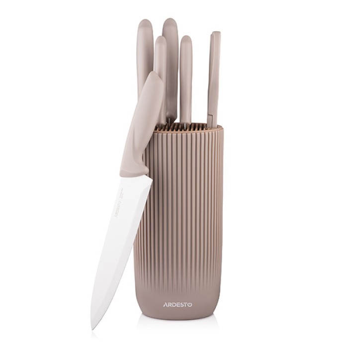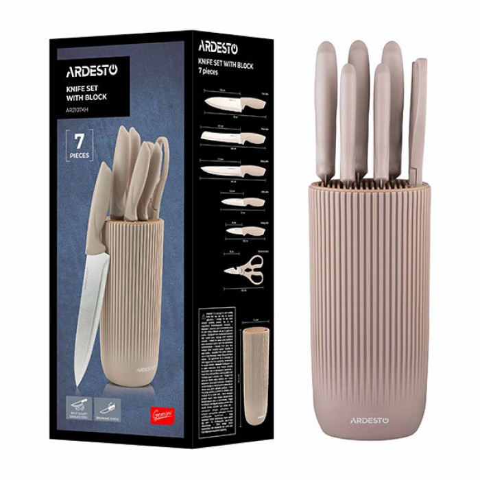 Набір ножів із блоком ARDESTO Gemini – ліпший вибір для сучасної кухні. У складі набору 7 предметів, кожен з яких призначено для роботи з продуктами різної текстури та форми. Леза з якісної нержавіючої сталі 3CR13 забезпечують довговічність і стійкість до корозії, надаючи змогу легко справлятися навіть зі складними завданнями. Пластикові руків’я гарантують зручний і надійний хват, а пластиковий блок – безпечне зберігання та організованість на кухні. Основні характеристики: - Матеріал леза: нержавіюча сталь 3CR13 - Матеріал руків’я: пластик - Матеріал блока: пластик - Кількість предметів: 7 шт.