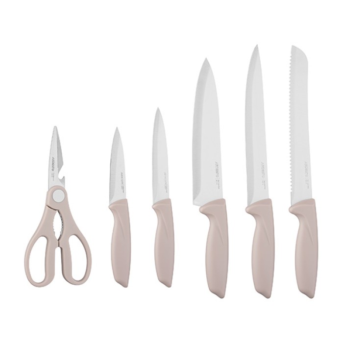 Комплектація: - Кухарський ніж 19,5 см - Ніж для хліба 21,5 см - Ніж для нарізання 21,5 см - Ніж універсальний 12,5 см - Ніж для чищення овочів 10 см - Кухонні ножиці 20 см - Пластиковий блок.