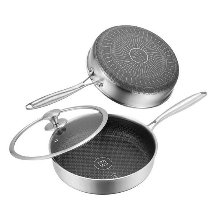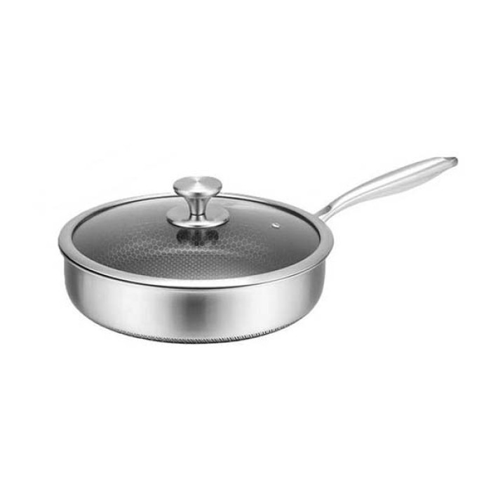 - Глибока Сковорода З Кришкою - Розмір 26x7,0 см., (3,6 Лтр.) - Тришаровий Матеріал Із Нержавіючої Сталі - Внутрішній — Текстурована Нержавіюча Сталь З Антипригарним Покриттям (Стільниковий Текстурована) - Середній - Алюміній Для Кращого Розподілу Температури - Зовнішній - Нержавіюча Сталь - Дно - Текстурована Нержавіюча Сталь (Стільниковий Текстурована) - Внутрішнє Чорне Тефлонове Антипригарне Покриття, - Гладке Та Елегантне Зовнішнє Покриття, - Стильна Та Ергономічна Ручка З Нержавіючої Сталі. - Скляна Кришка З Кнопка З Нержавіючої Сталі - Легко Носити - Легке Приготування, - Легко Очистити, - Підходить Для Всіх Типів Плит, Включаючи Індукційні. - Можливо Використовувати В Духовці До 220 ° С - Можливо Мити В Посудомийній Машині - Упаковка Подарункової Коробки
