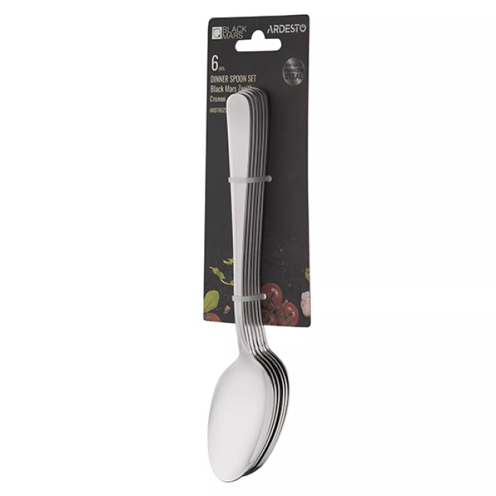 Столовые ложки ARDESTO Black Mars Zenith пригодятся как для ежедневного использования, так и для праздников. Набор состоит из шести предметов. Удобные ложки изготовлены из нержавеющей стали, которая отличается прочностью, гигиеничностью и коррозионной стойкостью. Имеют элегантный дизайн и эргономичную форму. Зеркальная полировка защищает ложки и сохранит эстетический вид длительное время. Изделия можно мыть в посудомоечной машине. Размер: 198 мм Толщина: 2.5 мм