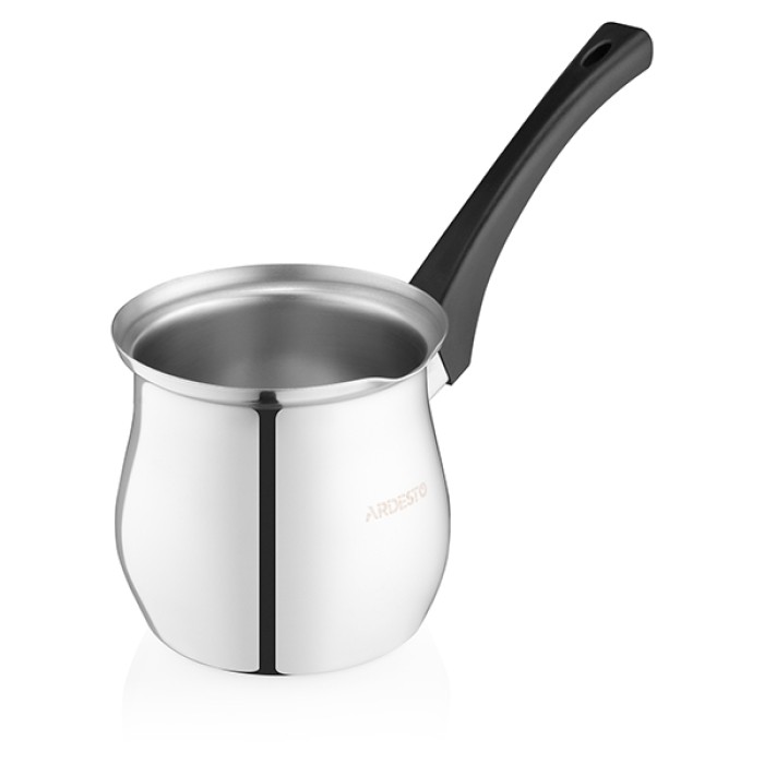Варіння кави в турці – це справжній обряд для любителів цього напою. Із туркою ARDESTO BLACK MARS об’ємом 0,64 л можна щодня насолоджуватися ароматною кавою. Виготовлена з нержавіючої сталі 18/10, товщина стінок становить 0,7 мм. Матеріал добре служить і вирізняється довговічністю. Турка має міцну, надійно закріплену бакелітову ручку. Посуд сумісний із газовими, електричними та склокерамічними плитами. Виробник не рекомендує мити в посудомийній машині. Діаметр: 8.7 см Товщина дна: 2.5 мм