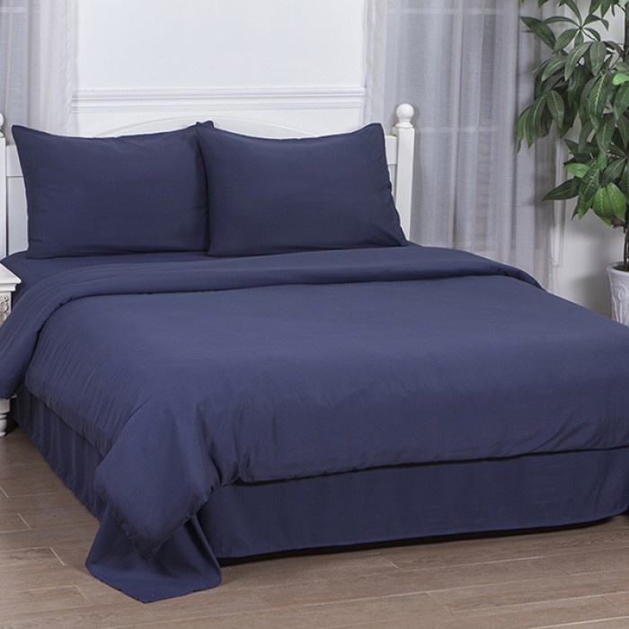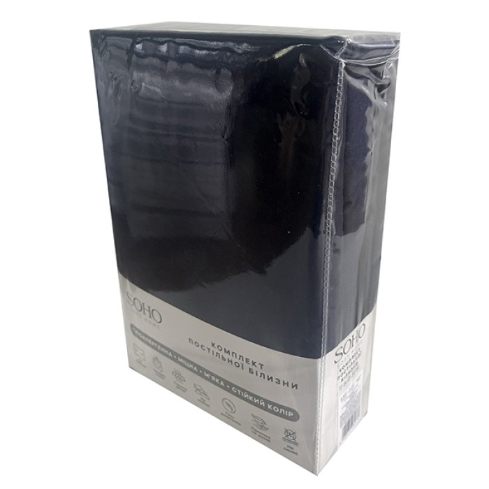 Характеристики: - Матеріал: поліестер 100%. - Колір: темно-синій. - Підковдра: застібка на блискавці. - Склад комплекту: простирадло 240х260 см – 1 шт, підковдра 200х220 см – 1 шт, наволочка для подушки 50х70 см – 2 шт