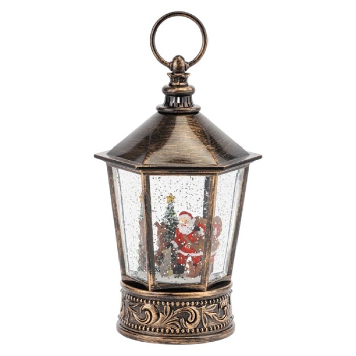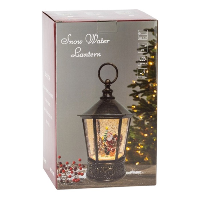 Новорічний ліхтар призначений для створення святкової атмосфери в інтер’єрі. Усередині конструкції розміщена декоративна композиція із Сантою та ялинкою, яка підсвічується LED-лампами теплих відтінків. Модель оснащена музичним супроводом з мелодіями на зимову тематику та механізмом автоматичного обертання блискіток, що імітують конфетті чи снігопад. Ліхтар працює від трьох батарейок типу AA, а також може підключатися до мережі за допомогою комплектного USB-кабелю. Корпус виробу виконаний у вигляді класичного ретро-ліхтаря з декоративним оздобленням. Виріб запакований у подарункову коробку, що робить його зручним для зберігання та транспортування. Такий святковий декор можна розмістити на столі, полиці або під ялинкою. Модель бренду представлена у висоті 26,5 см. Особливості: - Матеріал: пластик, скло. - Висота/Розмір: 26,5 см. - Комплектація: ліхтар, USB-кабель, подарункова коробка. - Функції: підсвітка, музика, автоматичний рух конфетті. - Живлення: 3 батарейки AA (не входять у комплект), USB-кабель (у комплекті). - Додатково: святкова декоративна композиція із Сантою або Сніговиком (уточнювати при замовленні).