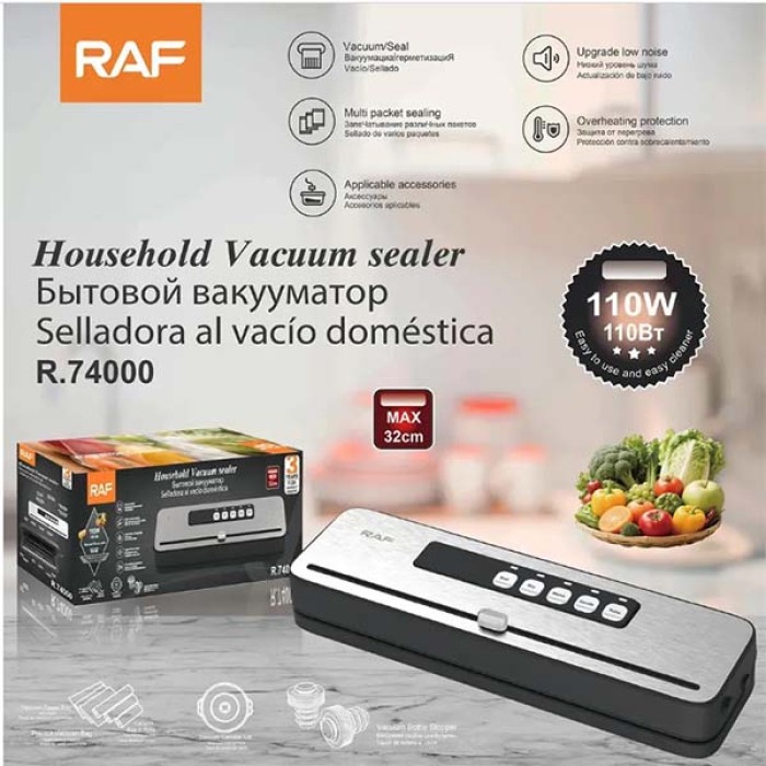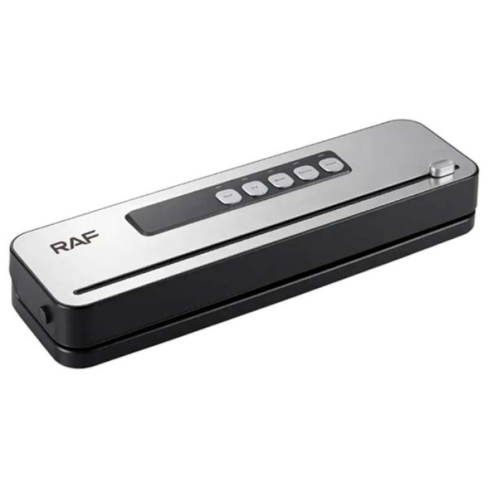 Побутовий вакууматор RAF R.7400, 110 Вт — надійний прилад для вакуумної упаковки продуктів у домашніх умовах. Він дозволяє продовжити свіжість продуктів, зберегти їхній смак, аромат та поживні речовини на тривалий час. Пристрій ефективно видаляє повітря з пакетів, запобігаючи окисленню, розмноженню бактерій і псуванню продуктів. Вакууматор оснащений напівавтоматичним керуванням, вбудованим різаком і регульованою швидкістю вакуумування. Він підходить для упаковки м’яса, риби, овочів, фруктів, круп та готових страв, а також для заморозки продуктів і економії місця в холодильнику. Переваги: Потужне всмоктування: вакуумний тиск від -45 до -65 кПа, ємність насоса 3 л/хв Продовження свіжості продуктів: зберігає смак, аромат і поживні речовини Універсальність: підходить для більшості харчових продуктів Швидка упаковка: час запаювання 10–17 секунд Компактний і практичний дизайн: настільний варіант легко розмістити на кухні Простота використання та очищення: автоматична робота і легке обслуговування Енергоефективність: клас А, потужність 110 Вт У комплекті: 10 вакуумних пакетів для зручного початку роботи Характеристики: Матеріал корпусу: нержавіюча сталь Тип управління: напівавтоматичний Об’єм упаковки: 1,1–2,0 л Вакуумний тиск: -45…-65 кПа Ємність насоса: 3 л/хв Вбудований різак для пакетів Час запаювання:10–17 секунд Потужність: 110 Вт Джерело живлення: електричне Комплектація: 1. Побутовий вакууматор RAF R.7400 2. 10 вакуумних пакетів 3. Інструкція з експлуатації