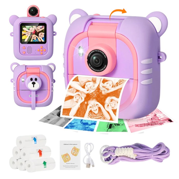 Переваги: 1) Дитячий фотоапарат стимулює творче мислення й фантазію, даючи змогу дітям висловлювати свою індивідуальність через світлини. 2) Миттєвий друк: Вбудована функція миттєвого друку дає змогу дітям відразу бачити результат своєї роботи, створюючи унікальні фотографії. 3) Наявність стикерів, рамок і малюнків у фотоапараті додає інтерактивності, даючи змогу дітям декорувати свої знімки та розвивати творчі навички.